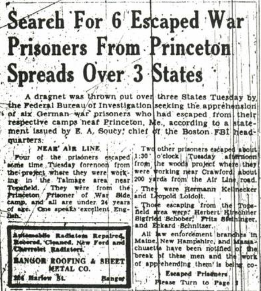 The first group of approximately 286 German soldiers arrived in Princeton on May 9, 1944. The prisoners were primarily from Rommel’s Afrika Korps or U-boat crews. Some had previously been held in Louisiana and made to pick cotton before being transferred to Maine, where they were primarily engaged in cutting pulpwood for local paper mills.