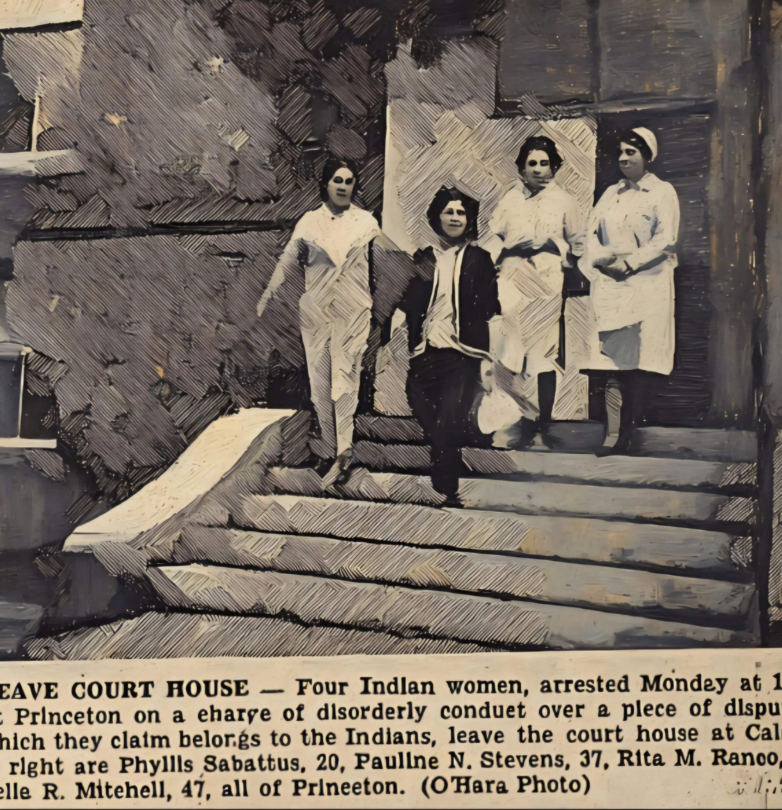 After being arrested on charges of disorderly conduct, for blocking the advance of a bulldozer on tribal lands, Phylis Sabattus (then aged 20 ), Pauline N. Stevens (37), Rita M. Ranco, and Delia R. Mitchell (47) leave the courthouse at Calais.